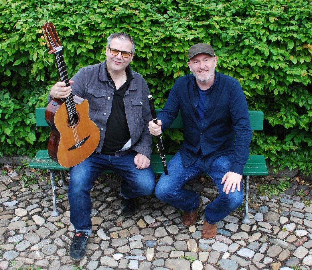 Die beiden spielen auf Flöte, Whistles, Gitarre und Akkordeon und singen auch dazu.
